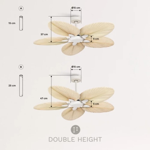 Las aspas de hojas de palmera natural alcanzan un diámetro de 132 cm, lo que funciona muy bien en espacios de hasta 28 metros cuadrados. Tiene un peso total de 9 kilos y medio, y dos barras para ajustar la distancia del techo, de modo que puede abarcar 39 o 49 cm verticales de un extremo a otro.